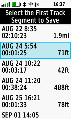 | (Menu) [Save Portion] | Select first track segment | Select last track segment | Edit track name if desired |