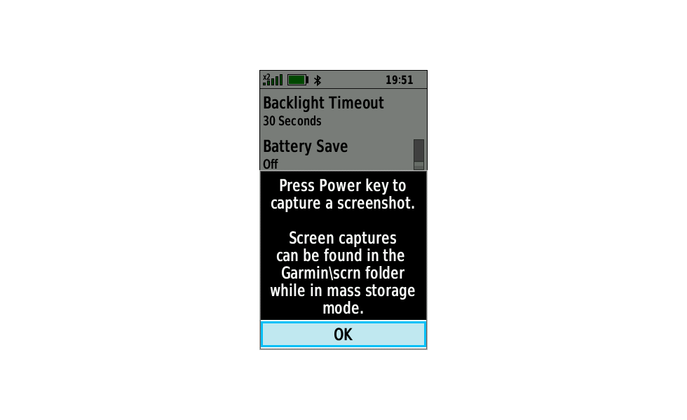 - Quickly cycle the Power Key to save images of the device screen to [GPSr]\Garmin\scrn\