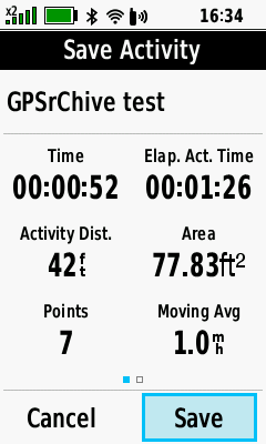 • Save the current activity recording in *.fit and *.gpx file formats (as configured).