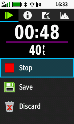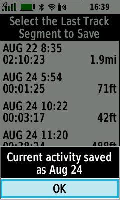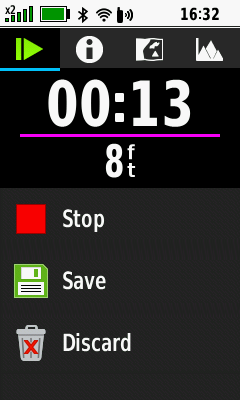 • Quickly save, delete, rename, resume or view statistics for the current activity tracklog recording.