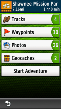An Adventure is a custom experience created by you or another user that can be comprised of tracks, routes, waypoints, geocaches, photos, and/or videos*. An Adventure ties all these pieces together and is assigned a name, difficulty, type, and other information to help you quickly decide if the Adventure appeals to your interests. These Adventures can be uploaded to an online database through BaseCamp for sharing or showing off. Not to mention the added benefit of not having to worry about accidentally deleting the files from your computer.