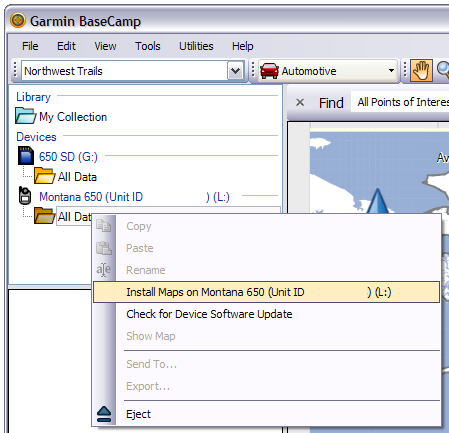 3. Right Click the "All Data" folder for the desired GPSr or uSD card in the Devices list and select "Install Maps on..."
