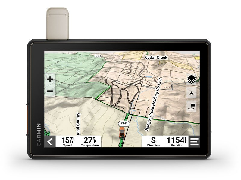 | Built-in inReach technology offers global satellite communication, two-way text messaging, location sharing and interactive SOS. | Tread features preloaded topographic maps with 3D terrain for North and Central America. It also includes detailed street maps of North America with Garmin Adventurous Routing options to take scenic and curvy routes. | Access U.S. public land boundaries for national forests, Bureau of Land Management (BLM), wilderness areas and more. Also, see U.S. private land boundaries and landowner information for parcels greater than 4 acres. |