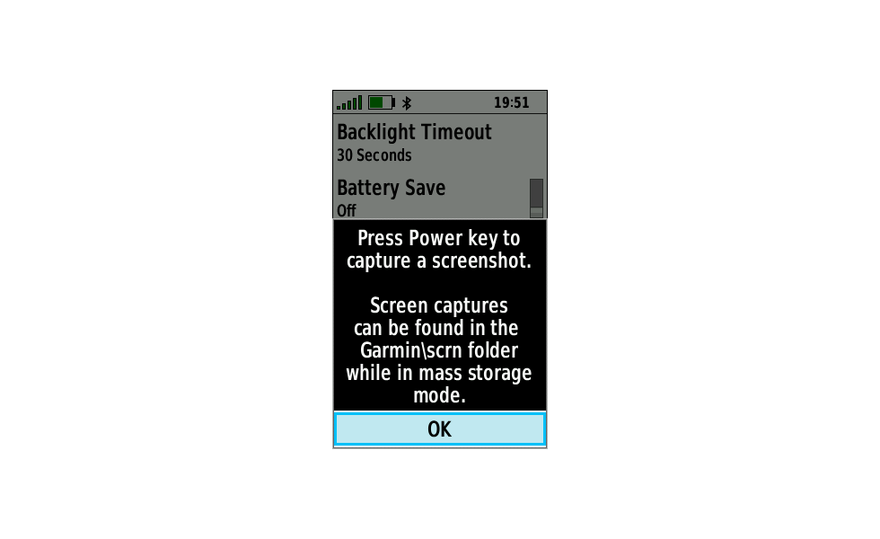 - Quickly cycle the Power Key to save images of the device screen to [GPSr]\Garmin\scrn\