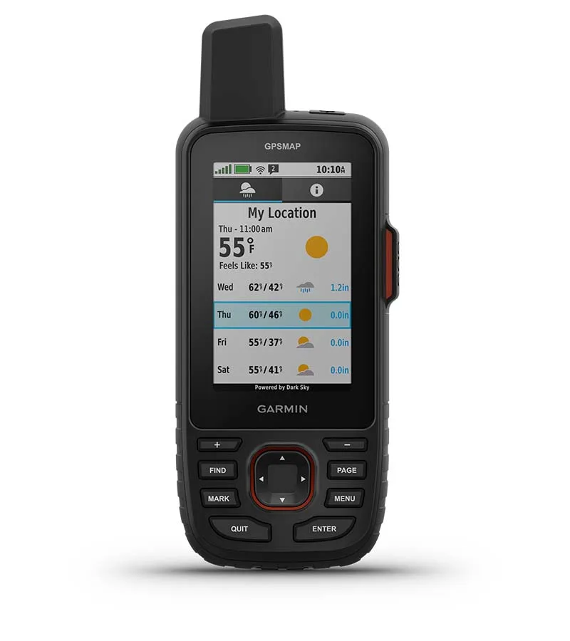 When connected to the Garmin Explore smartphone app, you can get real-time forecast information, so you’re aware of the changing conditions. Use inReach connectivity to get detailed weather updates on the GPSMAP 67i handheld. Request weather forecasts for your current location, waypoints or destinations on your route. Instead of relying on cellphone coverage, the GPSMAP 67i transfers your messages, SOS alerts and tracking via the global Iridium satellite network.