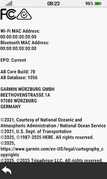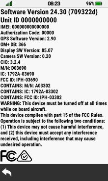 View Device and GPS software versions, Unit ID, IMEI and FCC ID, Display software and CIQ versions, EPO Status and copyright information.