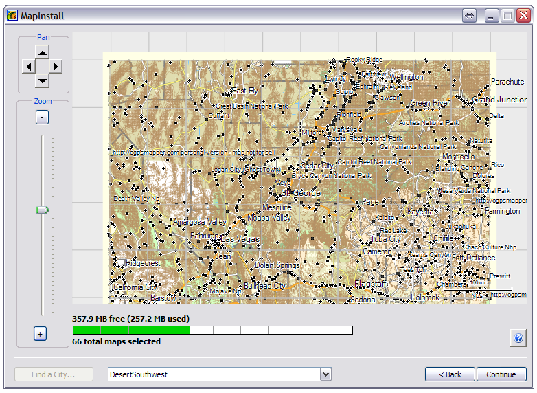 4. MapInstall displays a list of all available maps, map installation status, and memory usage for selected device
