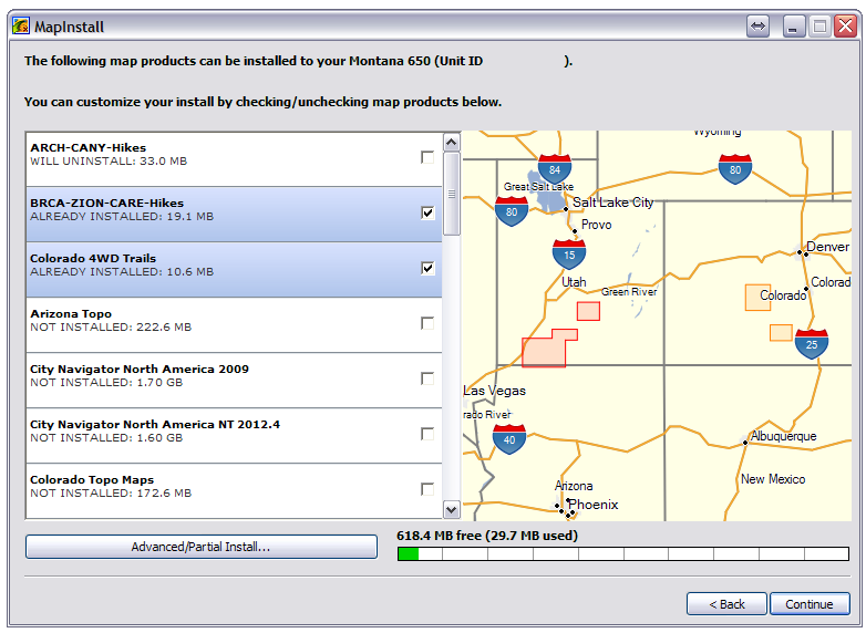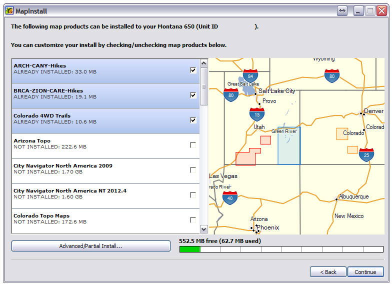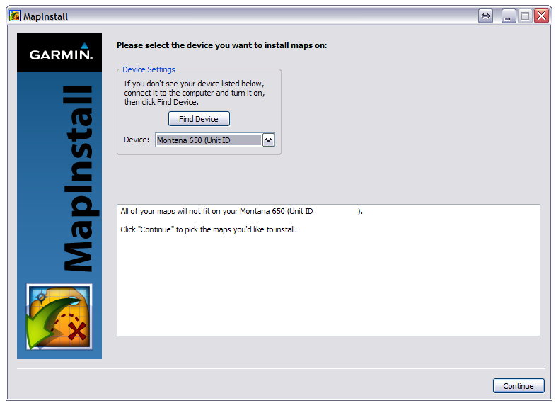 If the available memory on the selected device is insufficient to load all available maps, you must select "Continue" to choose the map segments you wish to send