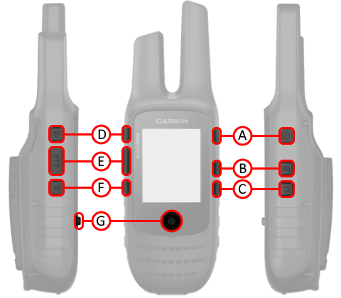 | move Thumb Stick (G) left or right to adjust display brightness. | 1. Press and hold to transmit audio over selected frequency (channel). | |